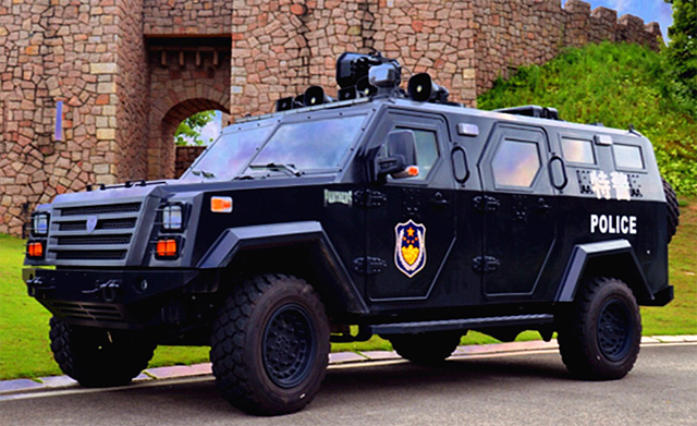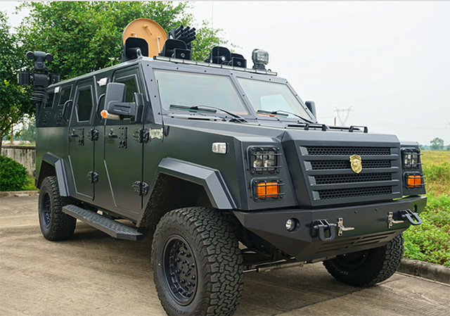 國產(chǎn)“黑豹”防暴裝甲運兵車是根據(jù)美國進(jìn)口福特E350改裝而成的5噸級防爆裝甲車。該車可搭載8名特警隊員,整車長5.8米,寬2.2米,高2.3米。車身采用進(jìn)口防彈材料制作并采用自主重疊式的防彈結(jié)構(gòu),防護(hù)性能優(yōu)越。該車試用于軍隊、武警、公安、邊防等部門執(zhí)行反恐維穩(wěn)、邊防巡邏、緝毒抓捕等任務(wù)。防暴裝甲運兵車該車還有5個車門,以確保隊員快速上下。超大馬力的進(jìn)口發(fā)動機,使得整車動力強勁,最高時速達(dá)140km/h。特警支隊相關(guān)負(fù)責(zé)人介紹:這輛“黑豹”防爆裝甲車可執(zhí)行追鋪、反恐、偵查、巡邏等任務(wù)。防暴裝甲運兵車同時配備了防彈輪胎,輪胎在中彈和刮破后任可繼續(xù)前行80多公里。該車車身四面防彈,前后裝有防撞保險杠,每個窗口都安裝了雙層防彈玻璃,車身周圍有8個射擊窗口,在防爆突出過程中可發(fā)揮巨大作用。國產(chǎn)“黑豹”車身上方配有38mm九管催淚炮,催淚炮可進(jìn)行360度旋轉(zhuǎn),最大仰角高達(dá)60度,射程至少200米以上。該車還配置了LED警燈警報系統(tǒng)和升降聚光照明燈,在處突過程中可以給犯罪分子造極大的震懾作用,極大地提升了人民群眾的安全感、滿意度。