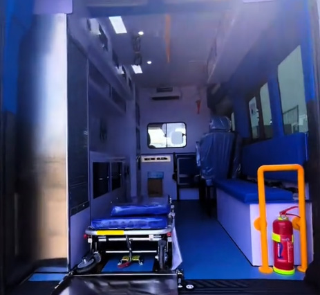 越野救護(hù)車的醫(yī)療艙,后門的右邊是一個鏟式擔(dān)架的固定位置。左邊掛著的是一個樓梯擔(dān)架,醫(yī)療艙的中間是一套自動上車擔(dān)架。左側(cè)是一個醫(yī)療柜,是帶卷簾門的氧氣瓶,兩個雙15升的氧氣瓶。還有醫(yī)療器械柜。在上面有四個上掀門式的柜門。中間是一組吊柜,下面是一組平臺柜。上面有220伏的電源插座,還有12伏的電源接口。旁邊做了匯流排,可以顯示氧氣瓶罐的壓力。還有兩個用氧終端,下面做了一臺這個負(fù)壓設(shè)備。左前艙有特別的裝置,所有車輛的集中控制,都在液晶大屏幕上面。上面有比較齊全的參數(shù),功能項(xiàng)非常的全面。中間隔斷頂部有個車載式空氣消毒機(jī)。中間是一個透明的觀察窗。折疊椅對講設(shè)備還有安全錘。車頂也做了220伏的電源插座。紫外線消毒燈,它是帶延時消毒的。右邊上部也是一樣有吊柜。也是非常實(shí)用的,右側(cè)有單人座椅配備三點(diǎn)式的安全帶。后面是三人的長條座椅,全部都配備了安全帶,座椅都做了骨架結(jié)構(gòu)非常的牢固。車都是做了大面積的軟包。防撞美觀都是不錯的。救護(hù)車我們也可以從中門下去。有上下車踏板。