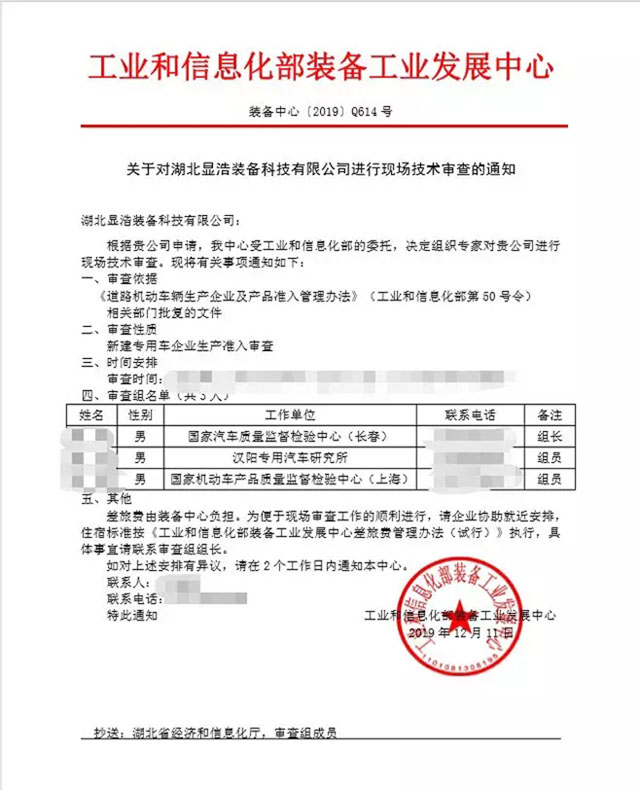 2019年12月19日湖北省顯浩裝備科技有限公司迎來了工信部委派的三位技術(shù)審查專家,三位專家對顯浩申請的專用車企業(yè)準入進行現(xiàn)場技術(shù)審查。依據(jù)《道路機動車輛生產(chǎn)企業(yè)及產(chǎn)品準入管理辦法》(工業(yè)和信息化部第50號令)經(jīng)過三天的嚴格審查。專家對顯浩在送血車、檢測車、監(jiān)測車、冷藏車等專用車的研發(fā)、生產(chǎn)、銷售、售后服務(wù)等能力方面給予高度認可,并一次性通過了現(xiàn)場審查。隨后將審查情況及材料匯報國家工信部專家組審查。