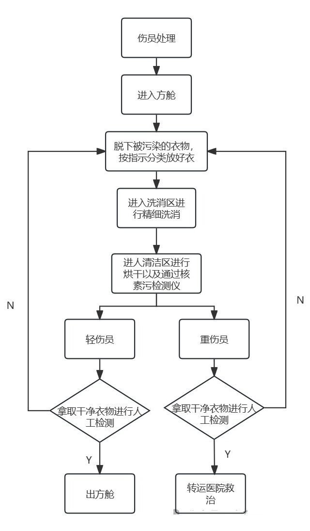 傷員處理->進(jìn)入核化污染洗消車(chē)->脫下被污染的全身衣物->按分類(lèi)放好衣服物品->在洗消區(qū)進(jìn)行精細(xì)洗消->進(jìn)入清潔區(qū)進(jìn)行烘干跟核污染素檢測(cè)->(輕傷員拿干凈衣服進(jìn)行檢查->出洗消車(chē))->(重傷人員拿干凈衣服進(jìn)行檢查->轉(zhuǎn)運(yùn)到醫(yī)院救治)