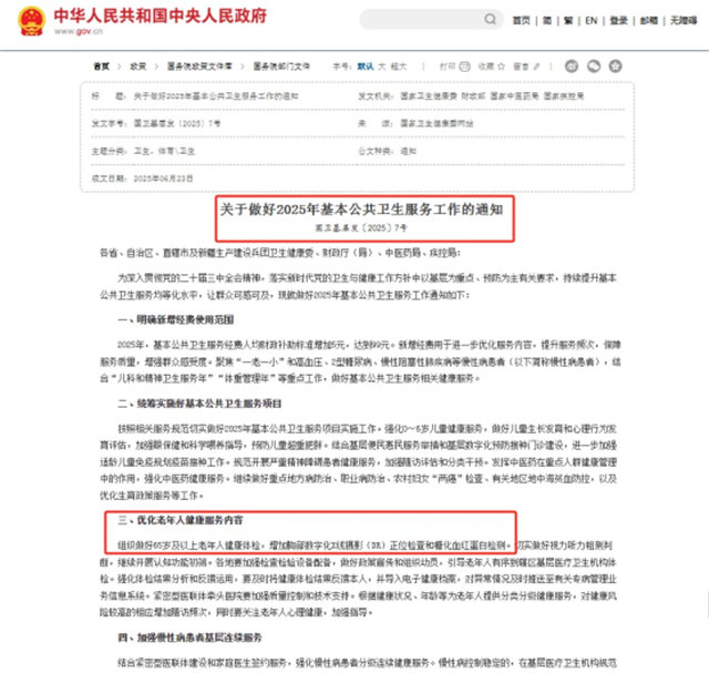 2025年6月,國家衛(wèi)健委、財(cái)政部等多部門聯(lián)合印發(fā)《關(guān)于做好2025年基本公共衛(wèi)生服務(wù)工作的通知》,首次將胸部DR正位檢查納入65歲及以上老年人免費(fèi)健康體檢項(xiàng)目。