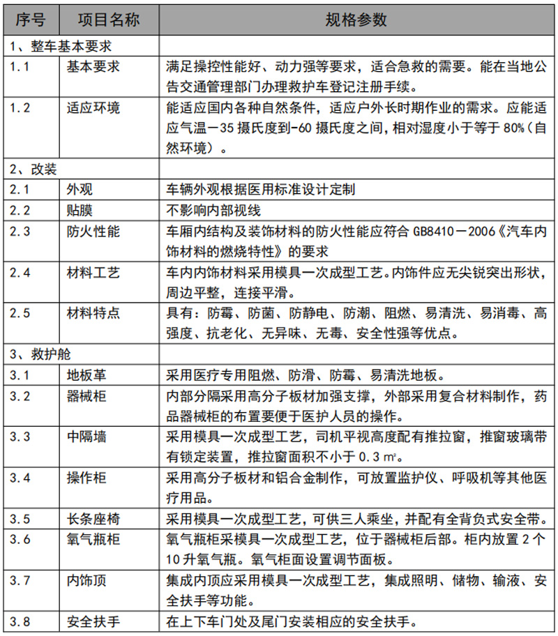 滿足操控性能好、動(dòng)力強(qiáng)等要求,適合急救的需要。能在當(dāng)?shù)毓娼煌ü芾聿块T辦理救護(hù)車登記注冊(cè)手續(xù)??梢允褂酶鞣N自然環(huán)境使用,戶外作業(yè)也不在話下。零下35度到60度都適應(yīng),小于80%濕度環(huán)境。符合GB8410- 2006 《汽車內(nèi)飾材料的燃燒特性》的要求。內(nèi)部分隔采用高分子板材加強(qiáng)支撐,外部采用復(fù)合材料制作,藥品器械柜的布置要便于醫(yī)護(hù)人員的操作。采用集成電路控制系統(tǒng),觸摸屏操作,可顯示日期,時(shí)間,溫度,濕度,時(shí)時(shí)監(jiān)控電池電壓,交流電壓,消毒燈開關(guān)及消毒時(shí)間的自動(dòng)控制,排風(fēng)及進(jìn)風(fēng)控制,吸引器的控制,逆變器控制,照明燈控制。