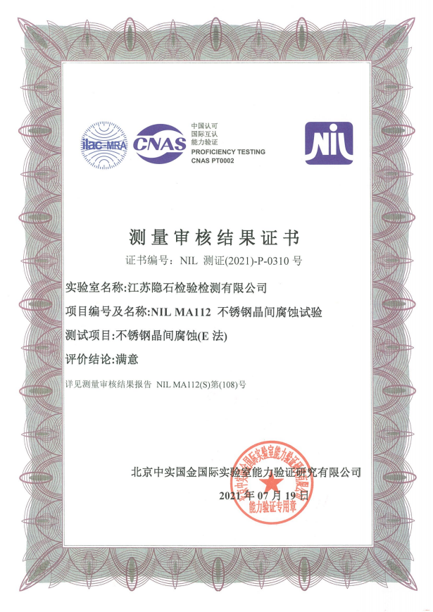 近日,江蘇隱石檢驗檢測有限公司取得了由北京中實國金國際實驗室能力驗證研究有限公司(國內(nèi)具有能力驗證提供者資格的第三方獨立法人機構(gòu),簡稱“中實國金”)頒發(fā)的不銹鋼晶間腐蝕檢測審核合格證書。由于測量審核是中國合格評定國家認可委員會(CNAS)判斷國家認可實驗室能力的重要技術(shù)依據(jù),隱石檢測根據(jù)認可要求參加了中實國金組織的測量審核,檢測中心的技術(shù)人員通過對中實國金發(fā)送的貴金屬盲樣進行認真、細致的檢測分析,得出了檢測結(jié)果,并提交給能力驗證機構(gòu)。中實國金經(jīng)審核評價給出...