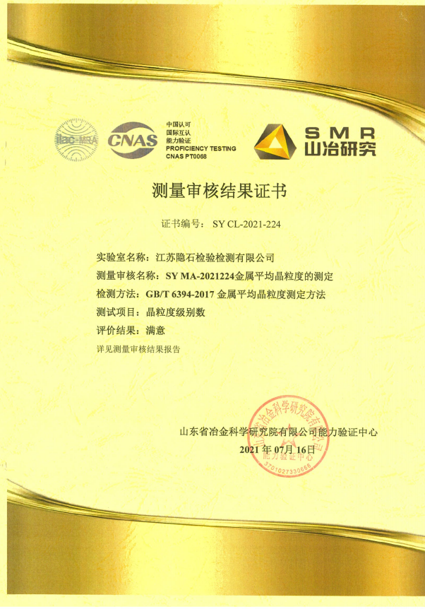 近日,江蘇隱石檢驗檢測有限公司取得了由山東省冶金科學(xué)研究院有限公司能力驗證中心頒發(fā)的金屬平均晶粒度檢測審核合格證書。由于測量審核是中國合格評定國家認可委員會(CNAS)判斷國家認可實驗室能力的重要技術(shù)依據(jù),隱石檢測根據(jù)認可要求參加了中實國金組織的測量審核,檢測中心的技術(shù)人員通過對山東冶金送的貴金屬盲樣進行認真、細致的檢測分析,得出了檢測結(jié)果,并提交給能力驗證機構(gòu)。中實冶金經(jīng)審核評價給出滿意的結(jié)論,檢測中心順利通過了本年度測量審核。作為金屬金相檢測能力國家認...