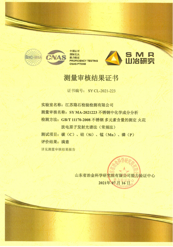 近日,江蘇隱石檢驗檢測有限公司取得了由山東省冶金科學(xué)研究院有限公司能力驗證中心頒發(fā)的不銹鋼成分檢測審核合格證書。由于測量審核是中國合格評定國家認可委員會(CNAS)判斷國家認可實驗室能力的重要技術(shù)依據(jù),隱石檢測根據(jù)認可要求參加了中實國金組織的測量審核,檢測中心的技術(shù)人員通過對山東冶金送的貴金屬盲樣進行認真、細致的檢測分析,得出了檢測結(jié)果,并提交給能力驗證機構(gòu)。中實冶金經(jīng)審核評價給出滿意的結(jié)論,檢測中心順利通過了本年度測量審核。作為金屬成分檢測能力國家認可的...