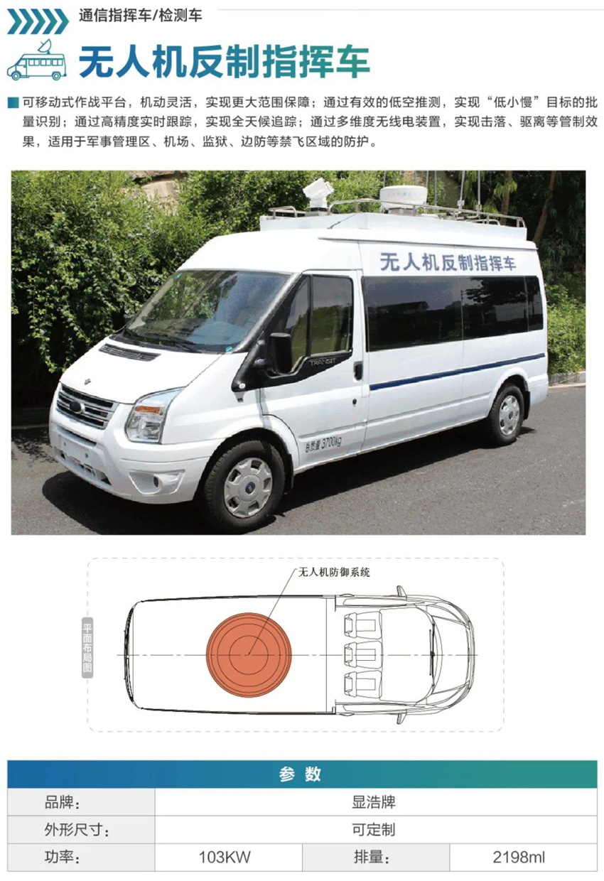 無人機反制車可移動式作戰(zhàn)平臺,機動靈活,實現(xiàn)更大范圍保障;通過有效的低空推測,實現(xiàn)“低小慢”目標(biāo)的批量識別;通過高精度實時跟蹤,實現(xiàn)全天候追蹤;通過多維度無線電裝置,無人機反制車實現(xiàn)擊落、驅(qū)離等管制效果,適用于軍事管理區(qū)、機場、監(jiān)獄、邊防等禁飛區(qū)域的防護。