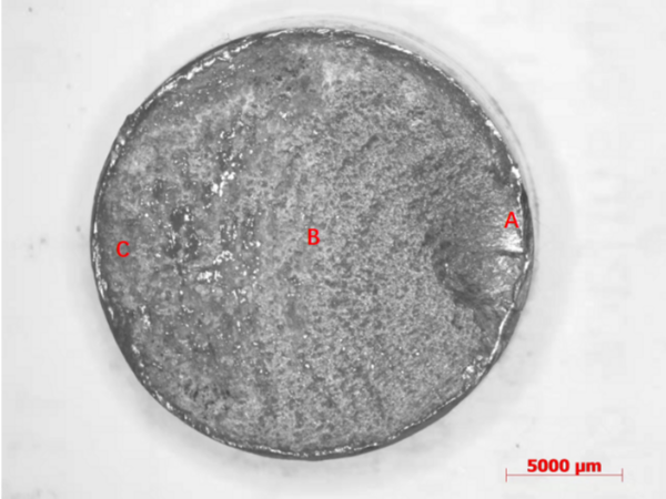 近日隱石檢測接到某公司委托,對機械零件進行斷口分析測試方法:JY/T 010-1996、GB/T 17359-2012圖1為來樣形貌,根據客戶要求對斷口形貌進行觀測。圖2為斷口體式形貌,宏觀來看,有周期擴展特征,且表面A區(qū)有摩擦特征,說明該區(qū)域斷裂較早,因此推斷從A區(qū)向C區(qū)方向擴展,詳見圖中標注。圖3為斷口A區(qū)形貌,可見邊部有明顯摩擦特征圖4為摩擦區(qū)域放大形貌,摩擦平整,無斷口特征;圖5為A區(qū)非摩擦區(qū)域微觀形貌,主要為撕裂小韌窩,部分區(qū)域有類似疲勞紋的褶痕...